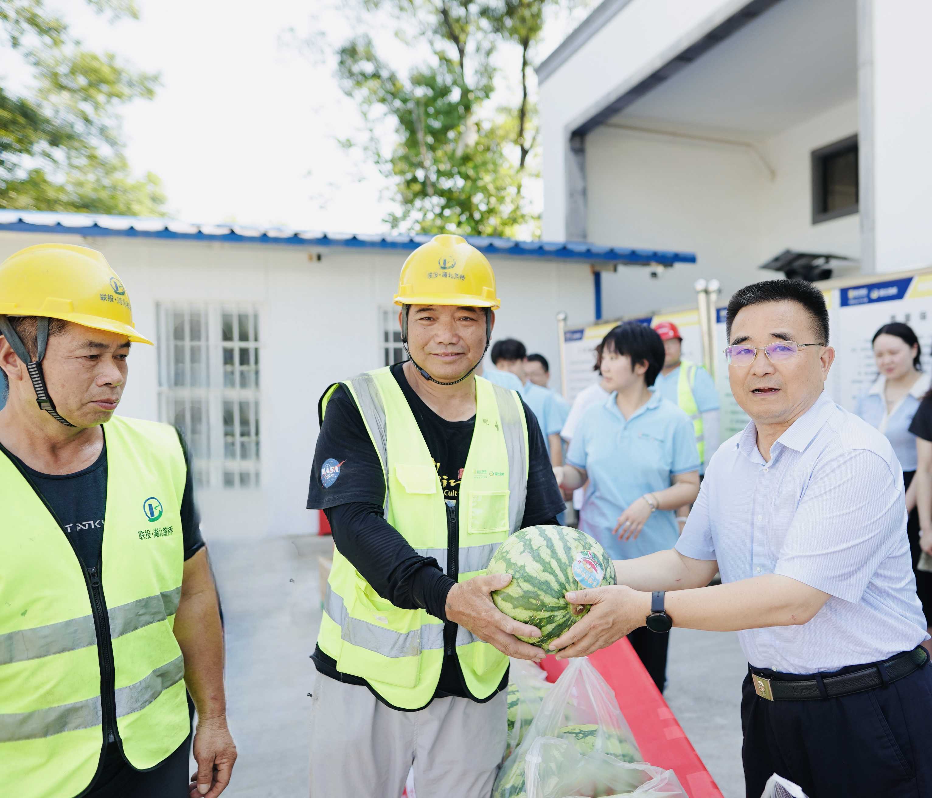 8月8日,湖北聯投黨委委員、副總經理汪繼明赴湖北路橋孝感高新區交通基礎設施項目調研,并開展“送清涼?送健康 送關愛”系列活動。湖北路橋黨委委員、副總經理、工會主席王華瑞,副總經理曾祥能陪同調研。