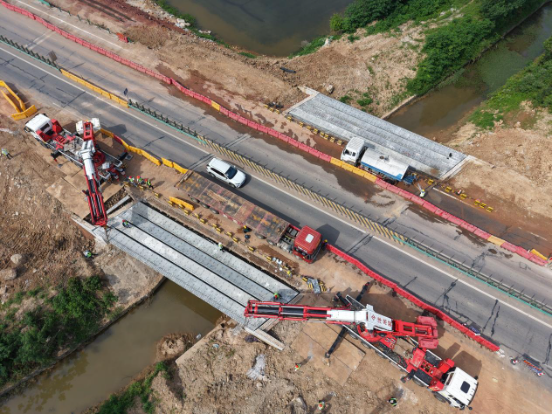 面對施工場地限制、高壓線路影響、邊通車邊施工等復雜難題,施工單位湖北省路橋集團有限公司通過精密設計演算,創新性提出采用85t折臂吊車方案,通過減少吊車配重、壓縮車輛轉幅半徑,既滿足現場實際施工需求,又顯著提高了吊裝作業的安全性能與機動性。同時,該公司成立技術、安全、施工專項工作組,聯合建設單位、監理單位構建“三位一體”安全管控體系,安排專人配合公安交管部門引導交通,全過程保障碧石港橋、瑪瑙嘴橋拼寬段32片空心板吊裝作業安全。